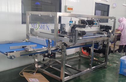 A small production line with conveyor; For slicing only; Good choice for slicing frozen dough, cake rolls, and so on.